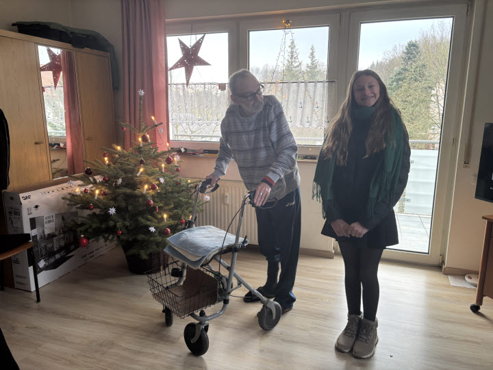 Dann ging es los: Wir folgten dem Pflegedienst kreuz und quer durch die festlich geschmückten Straßen. Unser Weg führte uns in Eigenheime, kleine Wohnungen und ins betreute Wohnen. Die älteren Menschen wussten nicht, dass wir kommen würden – nur, dass sie an diesem Tag eine kleine Weihnachtsüberraschung erwartete.