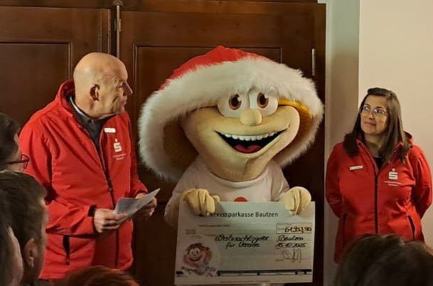 Umso größer war die Freude, als Florentine und Sebastian gemeinsam mit Frau Bursztynowicz als Vertreterin der FCS das Weihnachtsgeld der KSK Bautzen persönlich entgegennehmen durften. Diese Unterstützung macht es möglich, dem Kindergartenumfeld mehr Farbe, Kreativität und Lebensfreude zu schenken.